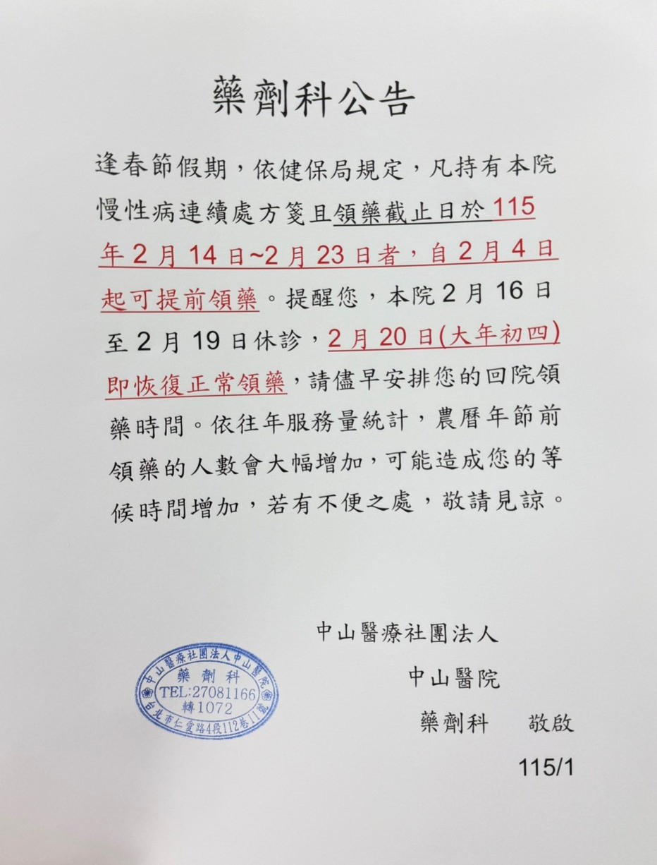 115年春節期間放寬慢性病病人回診處方給藥及慢性病連續處方簽第二或第三次領藥之說明