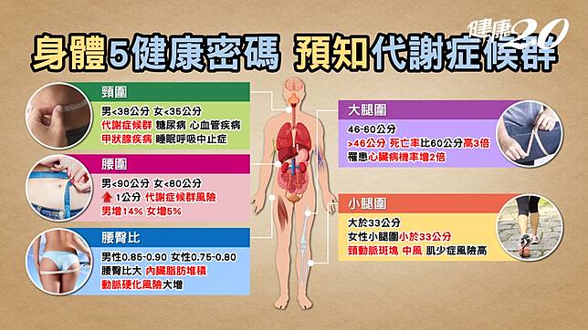 另外也有研究發現,大腿圍小於46公分的人,死亡率比大腿圍60公分高3倍、心臟病風險增2倍。而小腿圍小於33公分的女性,患有頸動脈斑塊的風險相對更高,有中風風險!頸圍和腰圍不能太粗,為什麼大腿和小腿反而愈粗愈好?邱正宏說,大腿圍和小腿圍主要跟身體肌肉量有關,越細代表肌肉量越少,而小腿肚的皮下脂肪會提升並儲存可促進血循的脂肪酸,避免頸動脈斑塊形成。大腿圍的標準值是46到60公分、小腿圍的標準值是大於33公分。