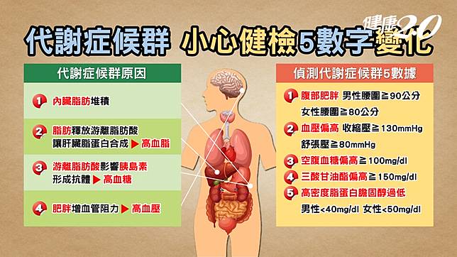 國際醫界已將腹部肥胖、和血壓高、飯前血糖高、三酸甘油酯高、高密度膽固醇偏低等,並列為代謝症候群的診斷標準,只要其中3項異常,即為代謝症候群,罹患心血管病和糖尿病的危險性和死亡率都升高。在台灣,男性腰圍90公分、女性80公分為標準尺寸。男性腰圍每增加1公分,代謝症候群風險上升14%、女生腰圍每增加1公分,代謝症候群風險增加5%。