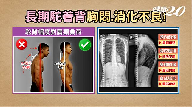 中山醫院家醫科醫師陳欣湄提醒,駝背不只外觀顯醜,還會引起很多身體的毛病。她指出,駝背時會壓迫到身體前方的胃和呼吸道,當事人容易出現呼吸不暢、胸悶和胃痛、消化不良,以下是駝背者容易出現的不適問題: